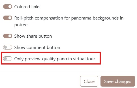 You can now enable the "Only preview-quality pano in virtual tour" option in the project settings. This feature is especially useful for contractors who prefer not to share high-resolution images until payment for their work has been received