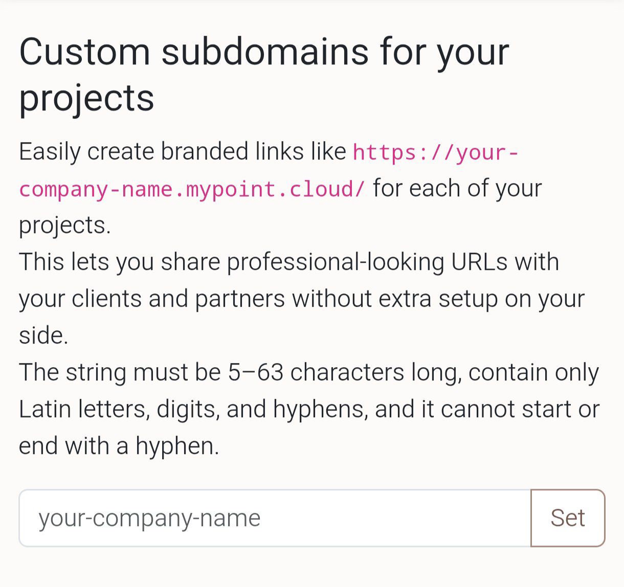 Easily create branded links like https://your-company-name.mypoint.cloud/ for each of your projects